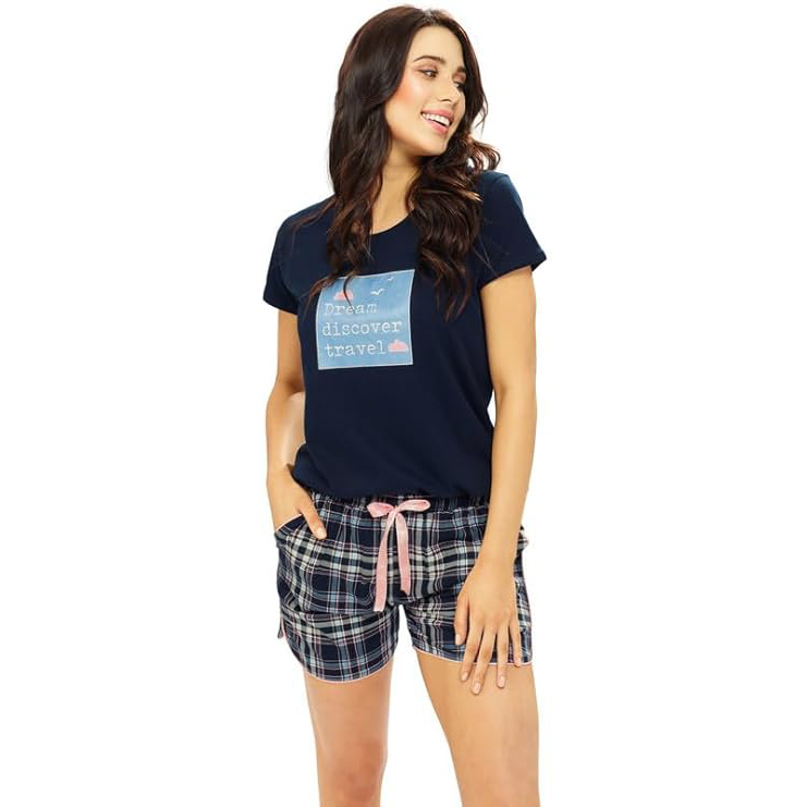 For the woman who loves a classic sleepwear look, this navy blue and plaid combination is an absolute staple. Featuring a comfortable graphic tee with the words “Dream, Discover, Travel” and contrasting pink-piped plaid shorts, this set screams Sunday morning relaxation. The relaxed fit ensures maximum breathability for those warm summer nights.