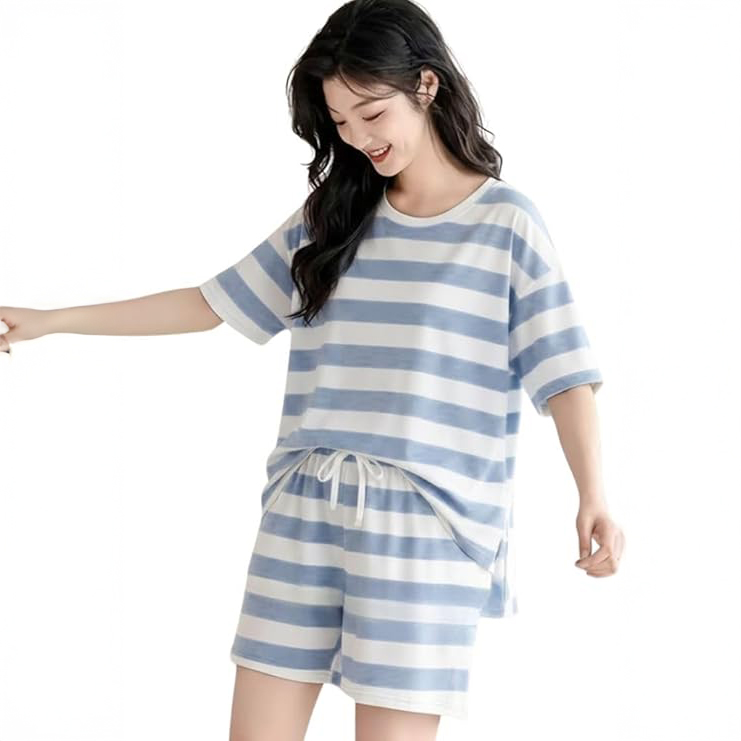 Stripes never go out of style, especially in the summer. This light blue and white thick-striped set offers a trendy, oversized fit that is incredibly forgiving and cooling. It gives off a very relaxed, effortless aesthetic that appeals to anyone who loves to keep things casual. The slightly longer sleeves and loose shorts make it the perfect outfit for padding around the house with a cold glass of iced tea.