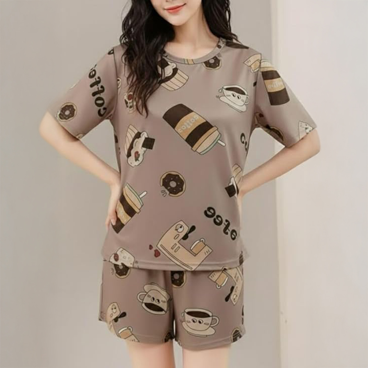 For the caffeine lovers, this mocha-colored set is too cute to pass up. Covered in an adorable print featuring coffee cups, donuts, and coffee machines, this outfit adds a touch of fun to the daily routine. The smooth, lightweight fabric drapes comfortably, making it an excellent choice for women who want their sleepwear to have a bit of personality.