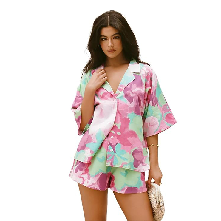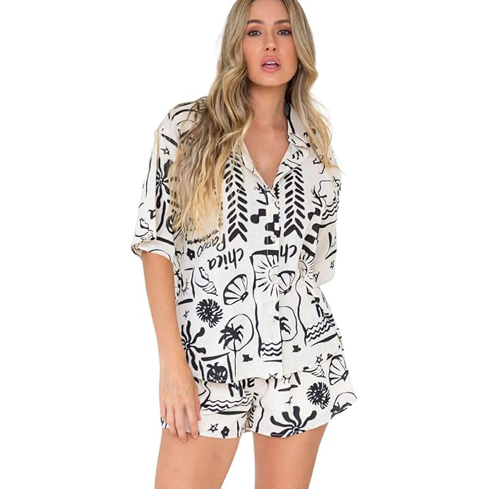 For the woman who loves artistic, bohemian vibes, this off-white set with black doodle prints is a total winner. Featuring abstract palm trees, shells, and sun motifs, this collared shirt and shorts set acts as chic daywear. The lightweight fabric ensures the wearer stays cool under the summer sun while looking effortlessly fashionable.