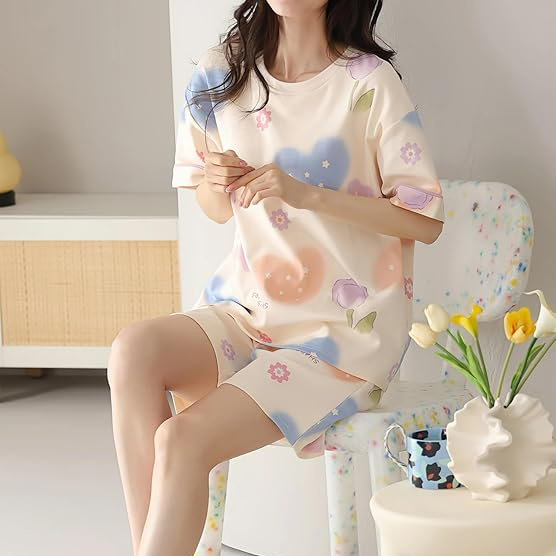 Channeling soft, feminine energy, this cream-colored set features floating pastel shapes, hearts, and flowers. It has a beautiful, dreamy quality to it. With a loose, drop-shoulder t-shirt and relaxed shorts, this outfit prioritizes extreme comfort without losing an ounce of cuteness. It is exactly what one wants to wear after a long, hot day at work.