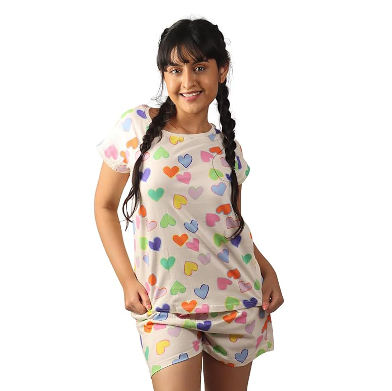 Bright, happy, and vibrant—this white set is scattered with colorful rainbow hearts that instantly lift the mood. The classic round-neck t-shirt and simple shorts make it an easy, fuss-free choice for everyday wear. It is youthful, fun, and made from a soft material that ensures comfortable wear throughout the muggy summer days.