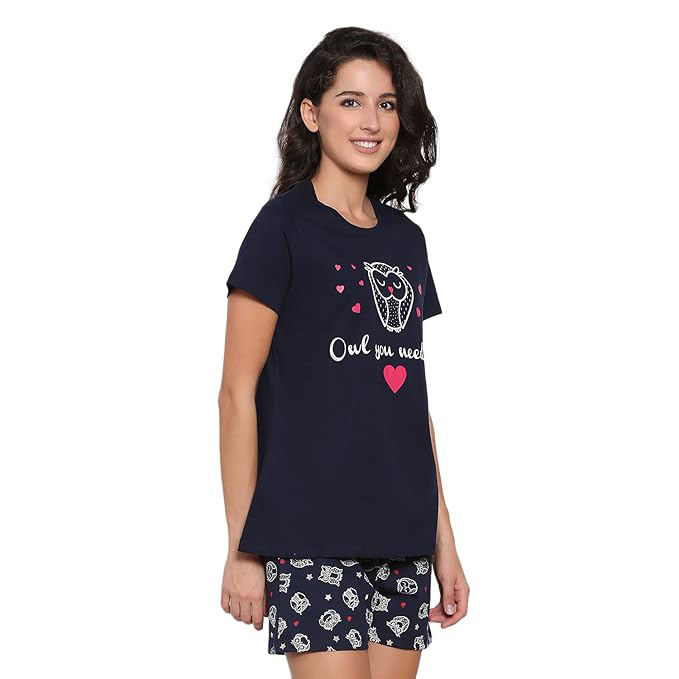 Who says dark colors are banned in the summer? As long as the fabric is light and breathable, navy blue is a fantastic, flattering choice. This adorable set features a cute owl graphic on the t-shirt and matching owl-printed shorts. It is the perfect, quirky nightwear choice for the woman who loves staying up late reading a good book or binge-watching her favorite series while the AC blasts in the background.