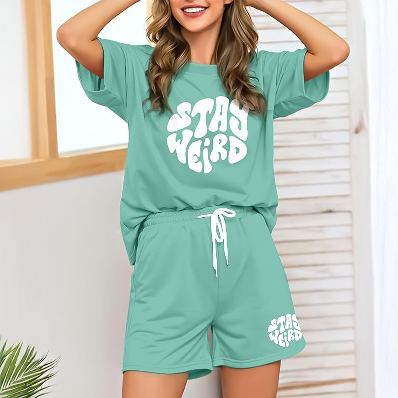 Mint green is arguably the most refreshing color to wear during a sweltering Indian summer. This oversized, baggy set features a fun, wavy retro font that says “STAY WEIRD” on both the tee and the shorts. It has a very modern, youthful, streetwear-inspired lounge vibe. The longline t-shirt and relaxed drawstring shorts make it an incredibly forgiving and comfortable outfit for days when tight clothing is simply out of the question.