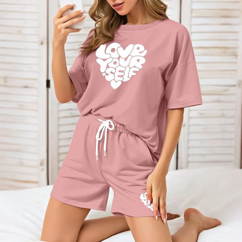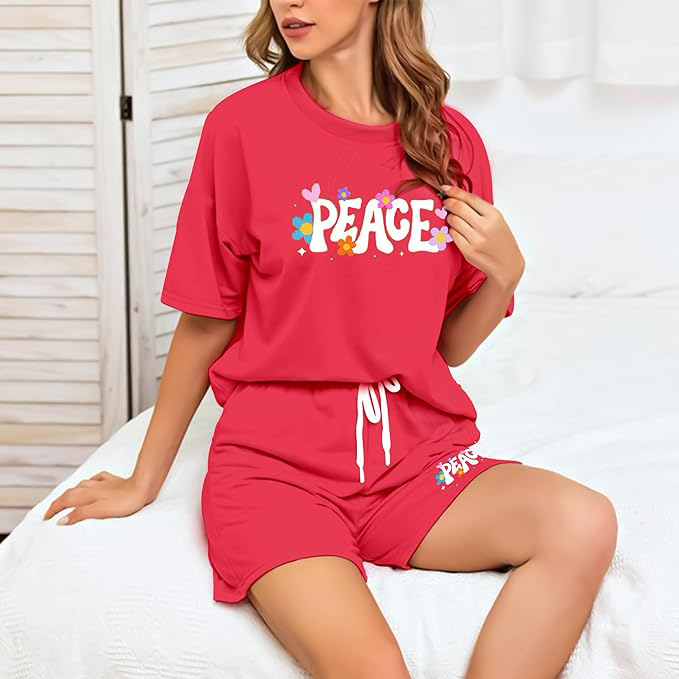 For the woman who loves a pop of bright color, this punchy coral-red set is a mood lifter. It features a fun, 70s-inspired “PEACE” graphic dotted with colorful retro flowers. Like the other oversized sets on this list, it prioritizes a loose, breathable fit with a thick, comfortable drawstring waistband. It is vibrant, energetic, and brings a fun splash of personality to an everyday summer lounge outfit.