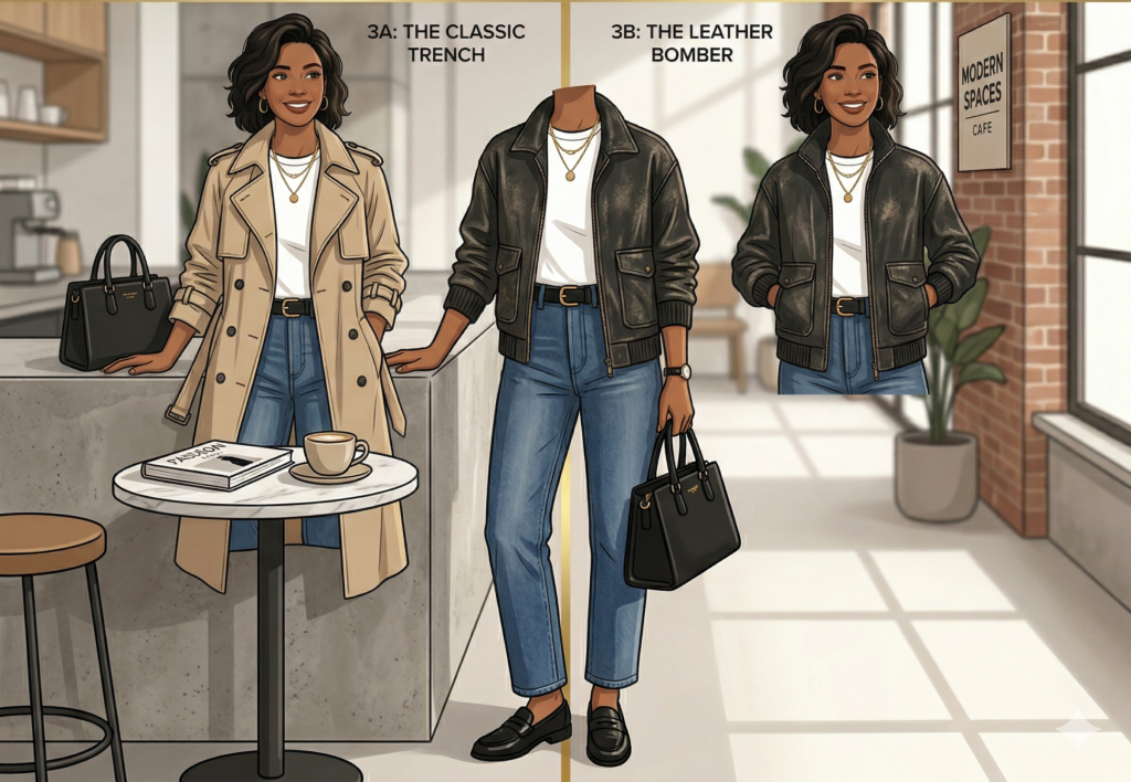 Formula 3: The Statement Outerwear (The Trench or Leather Bomber)