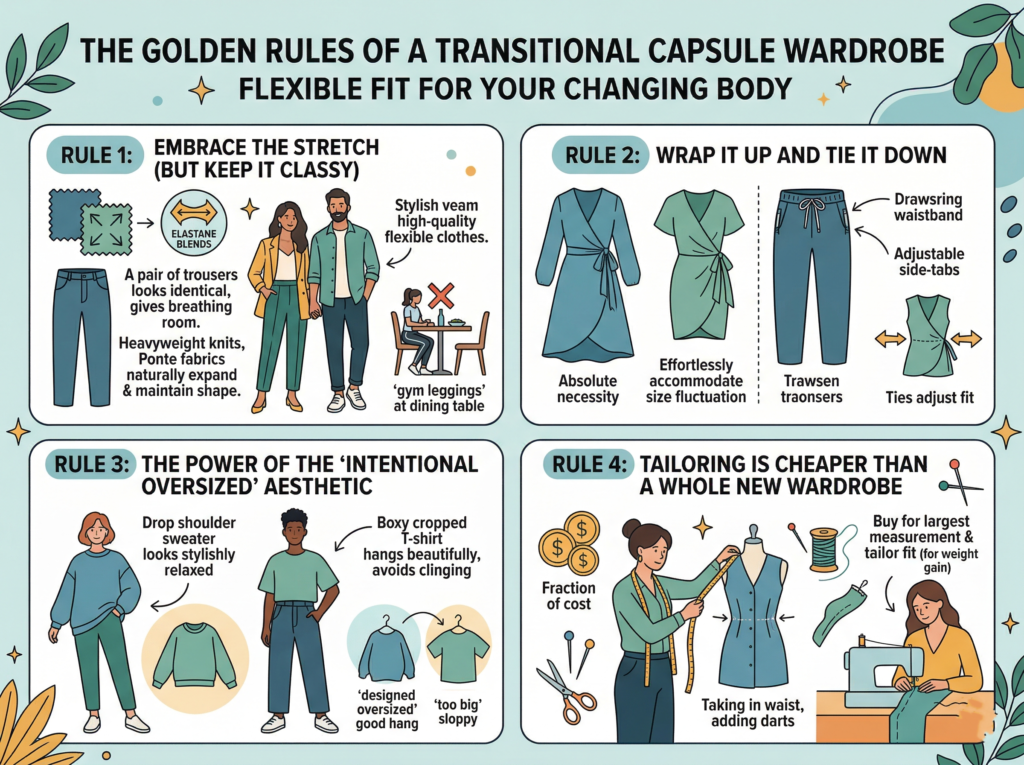 Infographic showing core transitional capsule wardrobe for women, including flowy tops, stretch fabrics, forgiving bottoms, wrap dresses, and adjustable waist outfits designed for comfort, flexibility, and changing body shapes.